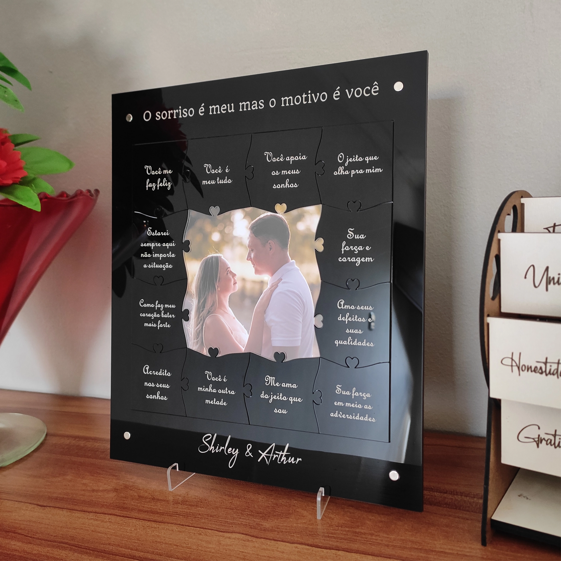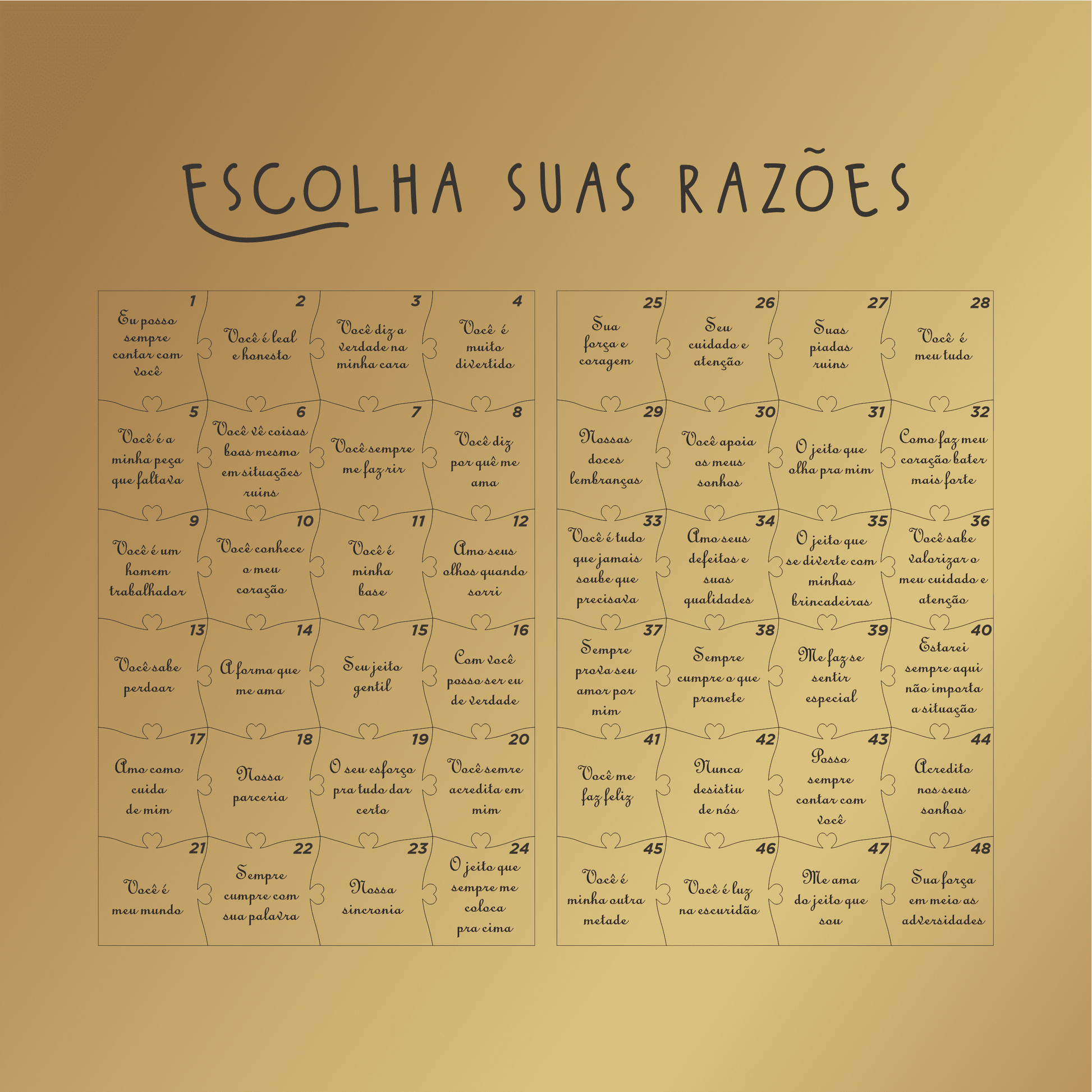 - 🧩 Design simbólico: peças em formato puzzle que representam união e amor.